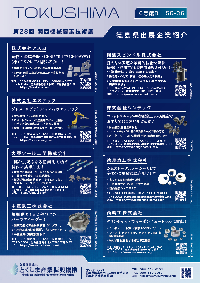 10月1日(水)~3日(金)にインテックス大阪にて開催予定の『第28回 関西機械要素技術展』のとくしま産業振興機構ブース内にて大亜ツール工学株式会社が出展いたします。場所は6号館B 56-36となります。皆さまぜひお越しください。